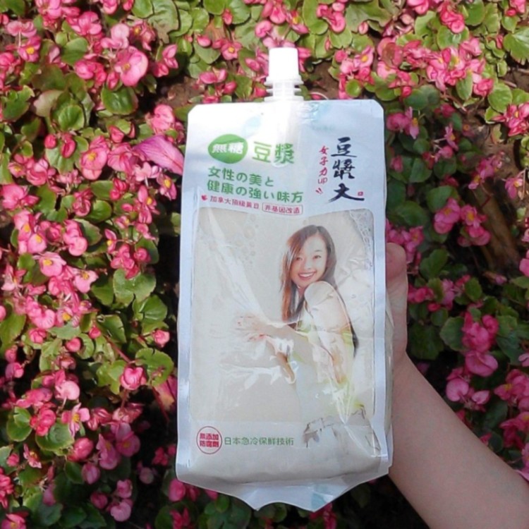 豆漿大濃豆漿包材,委託日商公司製作專利包裝袋,特殊吸嘴口設計,可直接吸飲,貼心又方便