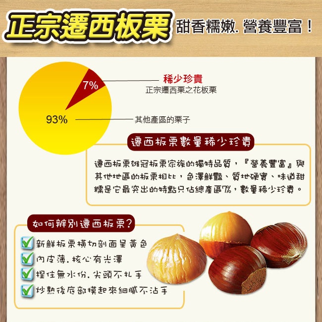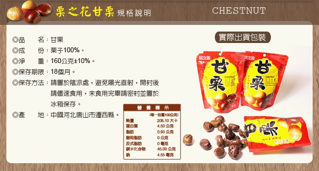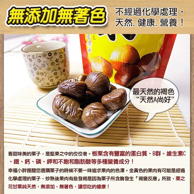 ◕『綠色標章』、『無公害產地認證』的百年老樹!◕ 中國馳名商標企業,品質有保障!◕ 嚴格要求衛生,遵守多道製作工序!◕ 高科技充氮包裝,確保栗仁原汁原味!◕ 天然健康小零嘴,不用剝殼開封即食!✚ 單筆訂單份數滿12份以上即可免運,未滿12份需自行負擔運費100元。 (配送僅限台灣本島,離島訂購請寄信洽詢)* 最後付款期限為到貨日前3天,若超過活動時間沒付款,訂單視同失效。* 訂單處理天數約3-4個工作天(不含例假日),4/1-4/5不到貨。* 可選擇到貨時段。* 為保障彼此權益,出貨順序與贈品皆以完成匯款者優先,未完成匯款前恕不預留到貨日。* 106年4月28日為最後到貨日,無法展延 請見諒。主購確認到貨日可配合再進行下單。