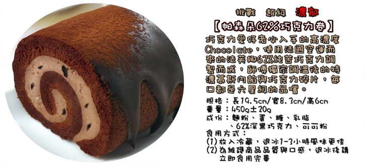 產品特色:2013蘋果日報蛋糕卷類評比冠軍,回購率超高的人氣商品!巧克力愛好者必入手的高濃度Chocolate,使用法國空運而來的法芙娜62%純苦巧克力調製而成,每口都是六星級的品嚐喔!
