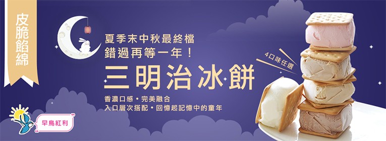 單筆訂單份數滿30份,主購禮三明治冰餅1個(任選口味)(價值23元)