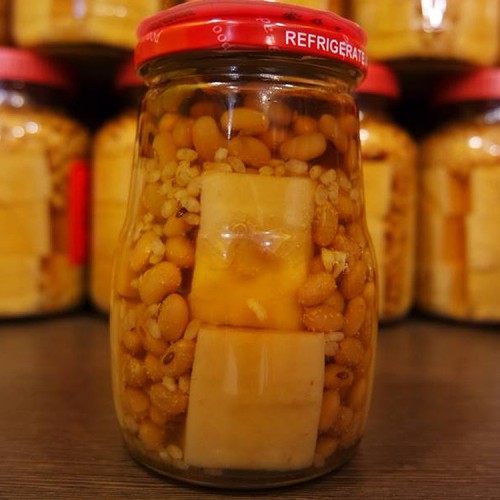 {旁邊有含豆類的豆腐乳(原味、紅麴、微辣 豆腐乳),在醬汁還呈較透明的時候就是還沒完全發酵完成,到醬汁呈深色時就是風味成熟了。}