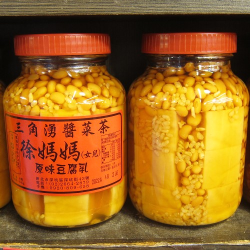 {旁邊有含豆類的豆腐乳(原味、紅麴、微辣 豆腐乳),在醬汁還呈較透明的時候就是還沒完全發酵完成,到醬汁呈深色時就是風味成熟了。}