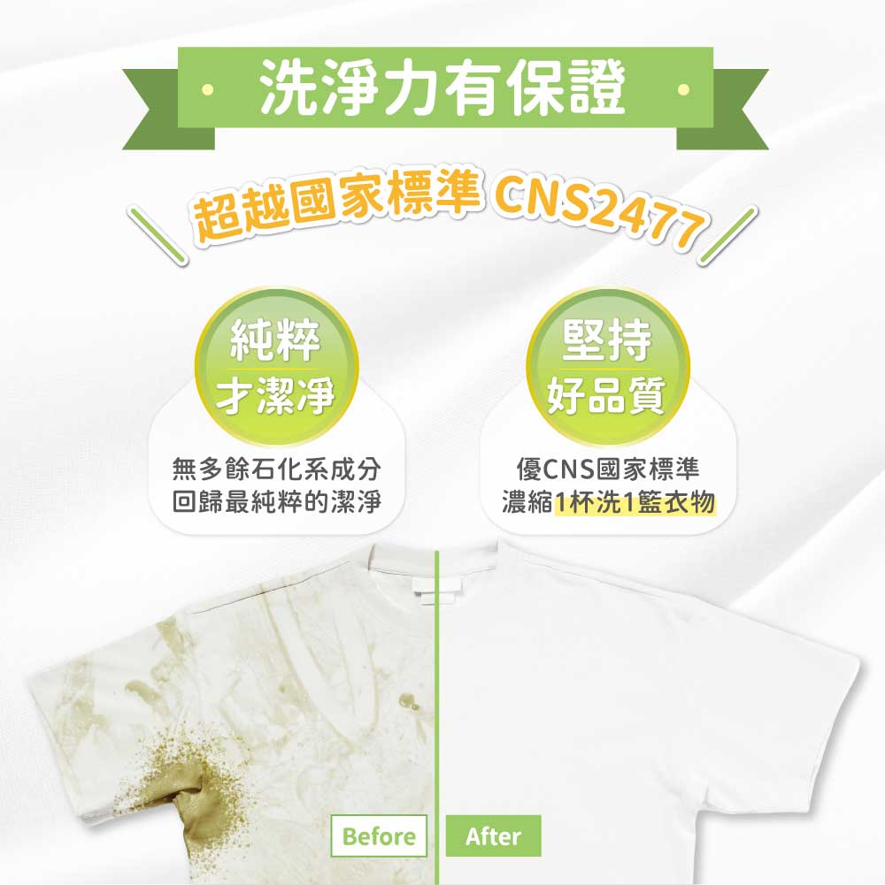 洗淨力有效程度超越CNS2477(洗衣類)國家標準以上。