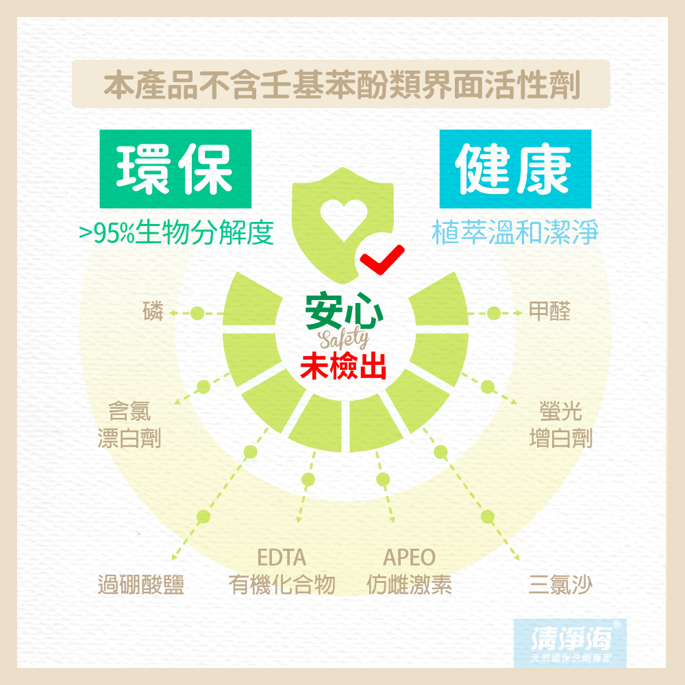 無添加(磷、螢光劑、甲醛、EDTA、重金屬、三氯沙、BHA/BHT、過硼酸鹽…等)多餘添加物