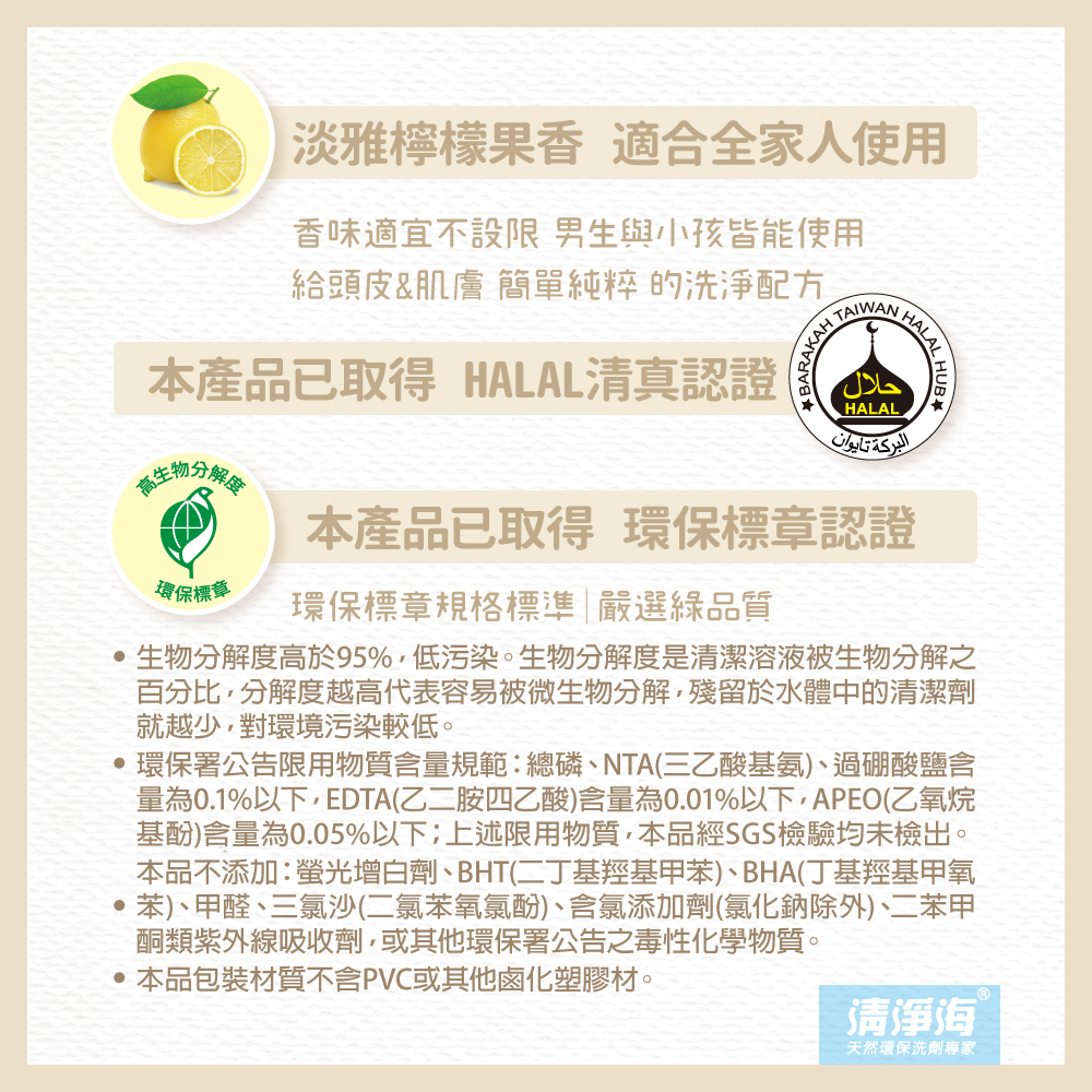 成 分:Water、Sodium Lauryl Ether Sulphate(SLES)、Cocoamidopropyl Betaine、Alkyl Polyglucoside(APG)、Coconut Diethanolamide、Food Grade d-Limonene(Citrus Terpenes)、Propyl p-Hydroxybenzoate、Citric Acid, Anhydrous、Sodium Chloride