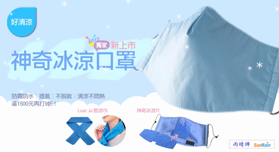 主購禮:單筆訂單每滿2,000元加送雨晴牌-第四代專利超防霧冰涼口罩*1。(抗UV防水或純綿,任選一個)