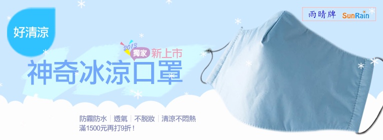 主購禮:單筆訂單每滿2,000元加送雨晴牌-第四代專利超防霧冰涼口罩*1。(抗UV防水或純綿,任選一個)