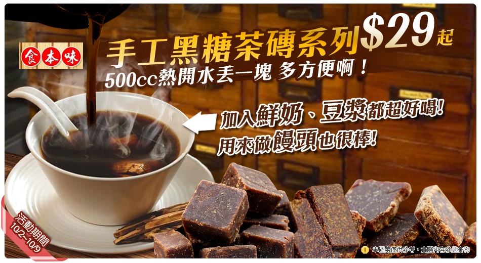 手工黑糖系列29元起所有商品滿6再送1!!500CC的保溫杯丟一塊四物下去沖熱開水,杯蓋旋緊就可帶出門食用前搖一搖就可以喝了,Look!多方便啊!每一合購或立即訂購,總訂購金額需滿600元(不需為倍數),就能享有大合購特惠及免運費;如訂購總金額未滿600元,需自行負擔運費80元。*單筆訂購總金額滿1000元 贈送大合購商品2份(任選)*本檔大合購最後到貨日為:10/30(二)(為方便店長接單生產出貨,先匯完款先排單先出貨,務必完款後安排再約定到貨喔!)