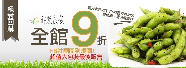 合購介紹 7/14(二)到貨 神農良食超對味下酒菜 國寶級MIT毛豆 榮獲神農獎肯吃過的都驚艷!全館大合購九折優惠 毛豆超值大包裝最後販售 最後優惠!!! | [大合購] 神農良食毛豆 ☞ 全館9折 超值大包裝最後販售