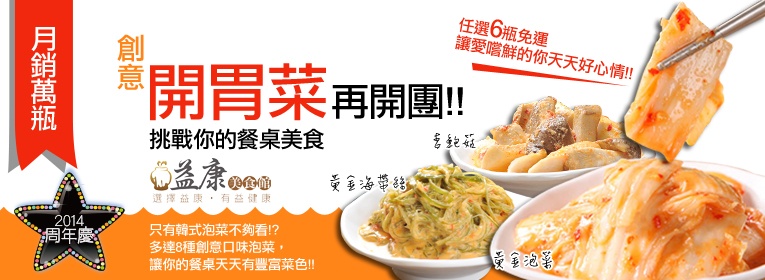 ● 只有韓式泡菜不夠看!? 多達8種創意口味泡菜,讓你的餐桌天天有豐富菜色!!● 任選六瓶免運,讓愛嚐鮮的你天天好心情!!✚ 訂單滿6份以上每瓶9折並免運,未滿6份以上需自行負擔運費150元。(配送僅限台灣本島,離島訂購請寄信洽詢 謝謝!)✚ 訂單滿12份以上,每瓶8折並免運✚ 訂單滿24份以上,每瓶75折並免運,再送主購禮一瓶(口味任選)*最後付款期限為前2天,若超過活動時間沒付款,訂單視同失效。* 訂單處理天數約3天(不含例假日)* 為保障彼此權益,出貨順序與贈品皆以完成匯款者優先,未完成匯款前恕不預留到貨日喔!: )* 103年12月3日為最後到貨日,無法展延 請見諒.請主購確認到貨日可配合再進行下單 感謝!