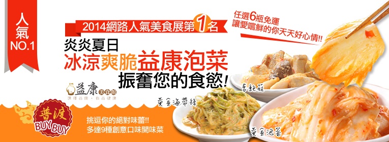 ● 第一名的醬汁搭配起死回生泡菜!!挑逗你的絕對味蕾● 多達9種創意口味開味菜,任選六瓶免運,讓愛嚐鮮的你天天好心情!!● 益康美食館黃金泡菜,特別選用山東大菜葉,獨門「起死回生醃菜法」,讓白菜呈現極佳之脆度✚ 訂單滿6份以上免運,未滿6份以上需自行負擔運費150元。(配送僅限台灣本島,離島訂購請寄信洽詢 謝謝!)✚ 訂單滿12份以上,每瓶88折並免運✚ 訂單滿24份以上,每瓶8折並免運,再送主購禮一瓶(口味任選)* 最後付款期限為前2天,若超過活動時間沒付款,訂單視同失效。* 訂單處理天數約3天。* 為保障彼此權益,出貨順序與贈品皆以完成匯款者優先,未完成匯款前恕不預留到貨日喔!: )* 104年8月9日為最後到貨日,無法展延 請見諒.請主購確認到貨日可配合再進行下單 感謝!