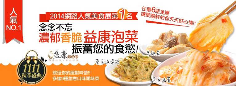 ● 益康美食館黃金泡菜,特別選用山東大菜葉,獨門「起死回生醃菜法」,讓白菜呈現極佳之脆度