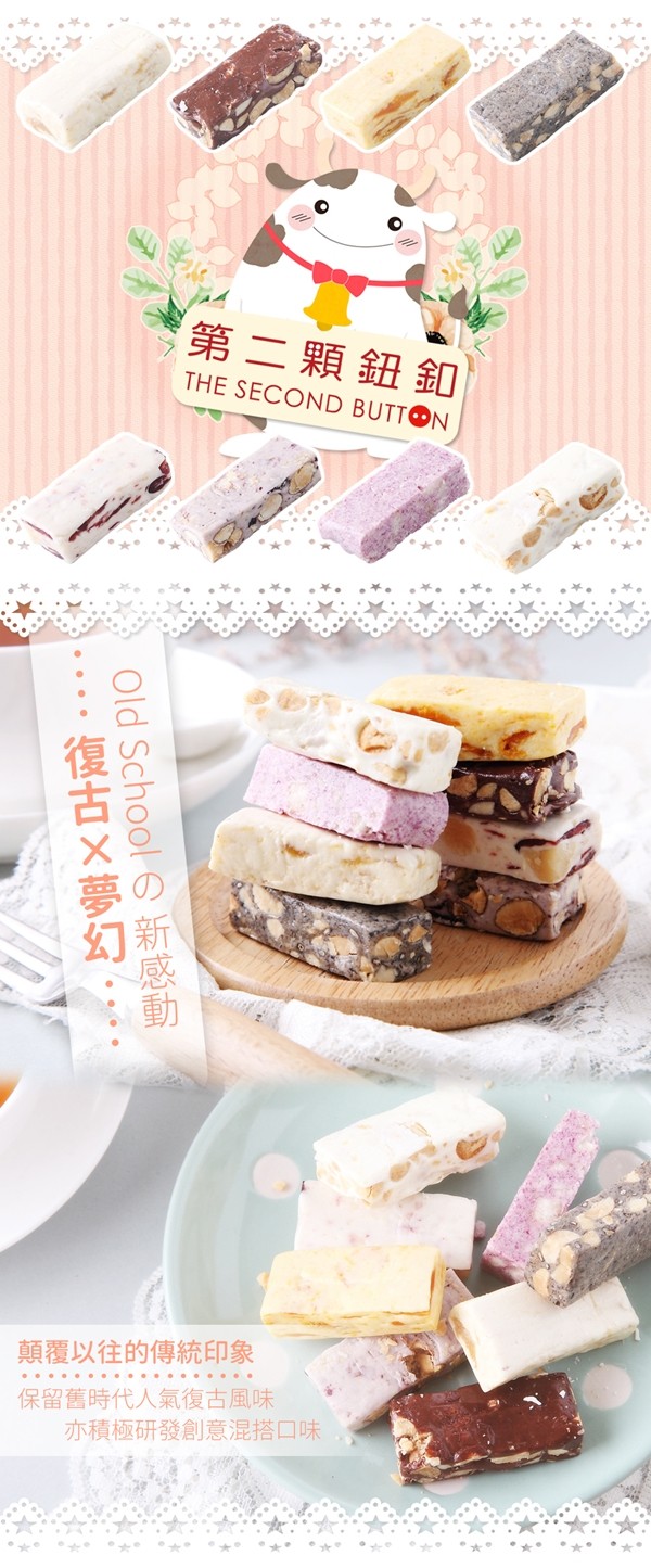 團購熱銷!《第二顆鈕釦》鮮牛軋!採用新鮮堅果及果乾作原料,師傅手工用心製作,香濃不膩,Q軟的口感深受大朋友小朋友歡迎!不僅是最用心的美味,粉嫩可愛的小提盒限定款,瞬間融化每個人的心,年節唯一限量優惠!✚ 單筆訂單份數滿16份以上即可免運,未滿16份自行負擔運費120元 (限台灣本島單一地址)。✚ 離島地區免運門檻:單筆消費滿35的倍數免運費,未達門檻,收取運費320元(配送限單一地址)* 最後付款期限為到貨日前10天,若超過活動時間沒付款,訂單視同失效。* 訂單處理天數約10天(不含例假日)。* 此檔到貨日為1/13、1/17-1/20、1/23、2/8-2/10、2/14-2/17到貨 其它不到貨* 宅配從1月中開始,無法指定到貨日,如有指定日期到貨,建議提早您的到貨日期,謝謝您* 請下單前確認好訂單口味、數量、日期 確認後請不要再修改~* 為保障彼此權益,出貨順序與贈品皆以完成匯款者優先,未完成匯款前恕不預留到貨日喔☺* 106年2月17日為最後到貨日,無法展延 請見諒。主購確認到貨日可配合再進行下單,感謝☺