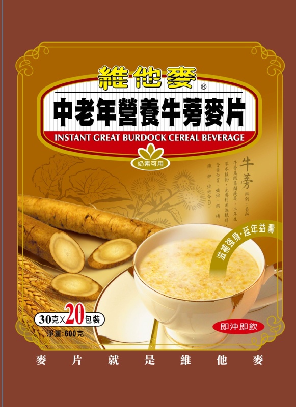 成 份:維他麥片(麥.米.麥芽糖.蔗糖玉蜀黍.鹽.香草)牛蒡萃取粉.低脂奶粉.糖.植物奶精。