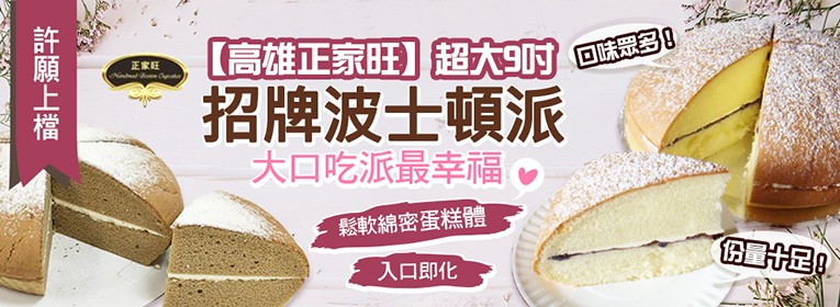 ♞ 高雄正家旺蛋糕坊,以入口即化的超綿密波士頓海綿蛋糕聞名,而延續製作柔綿口感的烘焙工夫~♞ 超大9吋波士頓派,口味眾多,份量十足,超值價只要160元!♞ 大口吃派最幸福,鬆軟綿密蛋糕入口即化♞ 黑巧布丁波士頓蛋糕,香濃可可搭配Q彈布丁,無敵美味!✚ 單筆訂單份數滿12份【倍數】即可免運,未滿12份的【倍數】需自行負擔運費150元。✚ 商品由黑貓配送(可選擇到貨時段)。✚ 配送僅限台灣本島,離島訂購請寄信洽詢。* 最後付款期限為到貨日前3天,若超過活動時間沒付款,訂單視同失效。* 訂單處理天數約7個工作天(不含例假日),國定假日、星期日不到貨。* 為保障彼此權益,出貨順序與贈品皆以完成匯款者優先,未完成匯款前恕不預留到貨日。* 107年8月3日為最後到貨日,無法展延 請見諒。主購確認到貨日可配合再進行下單。