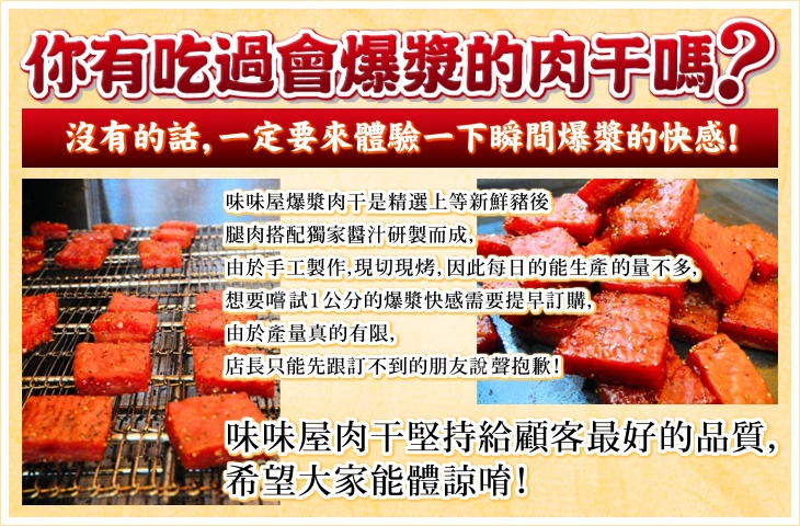體驗1cm厚的爆漿快感 口感層次豐富 又有絕佳的咬勁 真的好多汁!跟一般肉干很不一樣 獨家醬汁甜而不膩,口感Juicy有彈性 | [大合購] 味味屋肉干 ❖ 鮮嫩多汁 厚實的古早味肉乾超美味