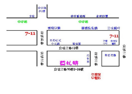 | 第二.幸福路右轉中平路三信銀行進來右轉遇到第一條馬上左轉到底右轉 |
