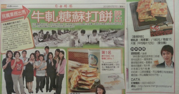 賀 喜得"低脂爆漿奶油餐包"獲選2010年8月20日"自由時報"票選人氣爆漿奶油餐包"入圍獎"