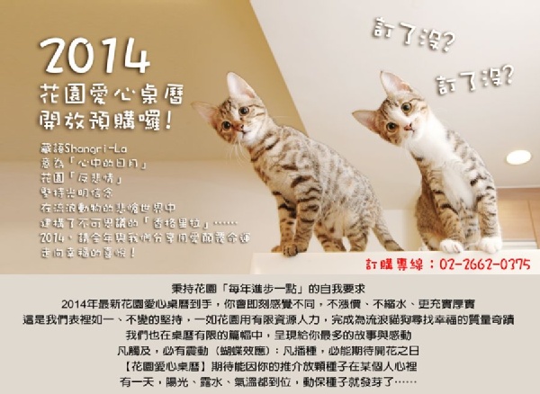 【2014花園桌曆預購開搶】藏語Shangri-La,意為「心中的日月」。花園「反悲情」,堅持光明信念,在流浪動物的悲愴世界中,建構了不可思議的「香格里拉」…… 2014,請全年與我們分享用愛顛覆命運、走向幸福的喜悅!
