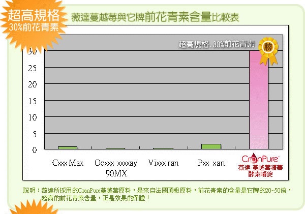 .與其它領導品牌之前花青素成份比較,挑戰全球最高規格!其含量高達30%,是它牌的20~50倍,具有較高的生物活性,能以較少的劑量就達到改變細菌叢生態之效果。