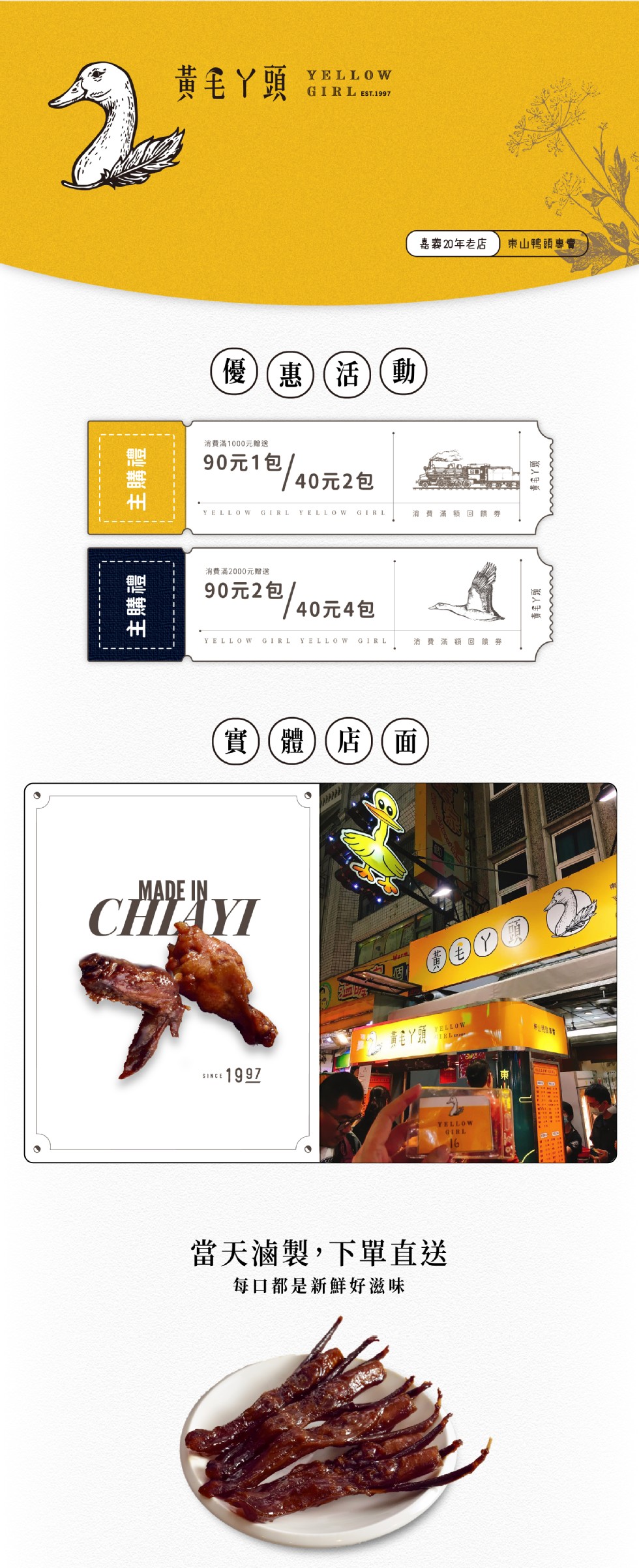 堅持每日新鮮古法正統滷製,每日嚴選上等新鮮食料,特殊中藥材獨家秘方,加上香濃20年的陳年滷汁,古早正統古法滷製成,現場再經過油炸香酥脆後,將其獨特甘甜味鎖住,使得外表酥脆內嫩特殊獨特風味--肉質香Q、甘醇美味、具有嚼勁、香味十足、口感絕佳,絕對是讓你一口接一口的好滋味~南部重口味的黃毛ㄚ頭滷得到獨特的回甘香氣,古法正統的古早味,鮮甜回甘允指回味,招牌有鴨頭、脖子、鴨舌、鴨腸、腳崙、鴨翅、豬蹄、雞腳、鳥蛋、豆乾………等,都是不能錯過的美味。