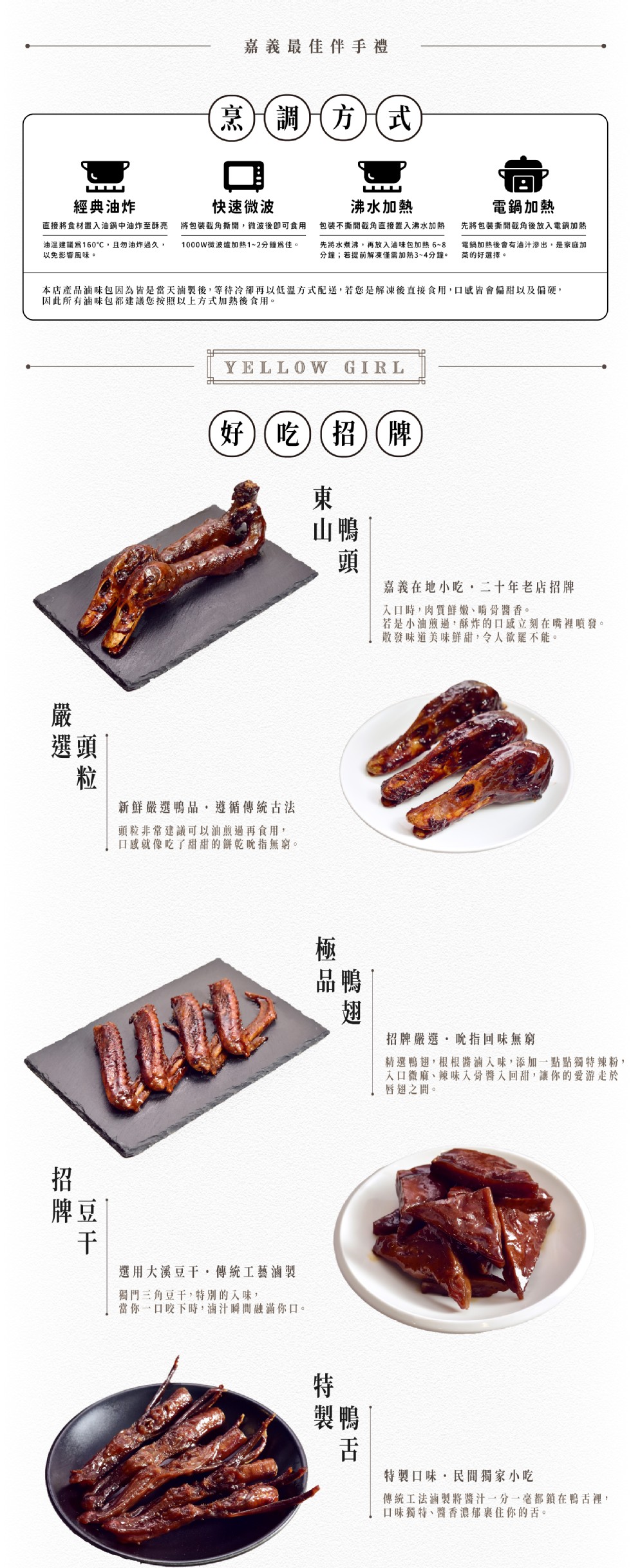 黃毛ㄚ頭 【東山鴨頭專賣店】創立於1997年,已在地經營20年是嘉義文化路夜市上特色小吃,獨特古早正統的東山鴨頭口味,傳承自府城家族40多年的古早正統古法滷製秘方,慢火熬成香濃20年的陳年滷汁,秉持專業的正統古法滷製秘方及每日堅持選用CAS當天新鮮嚴選肉品食材所滷製,絕不用冷凍食品及添加人工調味料及防腐劑,比一般的滷味多帶了點甘甜,咀嚼後口中四溢的香氣,甚至連啃骨頭都讓人覺得意猶未盡,口味獨特滿足無數饕客的味蕾。