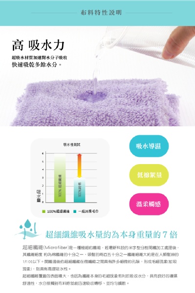 超細纖維材質(100% Microfiber) 絲滑柔順觸感不傷肌膚,超細纖維毛細現象可瞬間吸水力可快速吸附水分子,只有遇水部分是濕潤,旁邊仍是乾爽狀態,未達飽和前不會向外擴散。