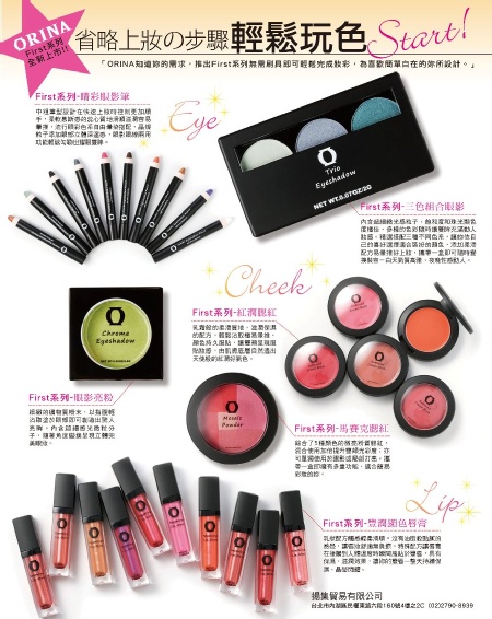ORINA彩粧擁有多年為歐美知名品牌製造彩妝的經驗,推出亮美豔麗的各種色系,抹彩再亞洲女性身上,顯色效果讓人驚豔,在各種光影之下,每一個角度都能讓妳明豔動人。