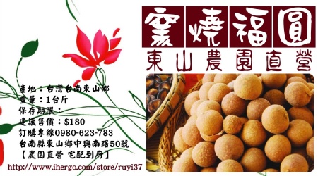 | 帶殼龍眼乾 | $120 | | 剝殼龍眼乾 | $180 | | 特級剝肉龍乾 | $299 | 產地:台南縣東山鄉 品種:粉殼龍眼 重量:1台斤 製造日期: 2011.8月新 鮮出爐 yahoo 拍賣 賣場 訂購方式: *ihergo站內下單 *專線訂購 0980-623-783 *YAHOO拍賣下標  yahoo 賣場 寄送方式: *YAHOO拍賣下標可 7-11 取貨付款 *郵寄包裹 *大榮貨運 付款方式: *郵局無褶存款 700 0001271-0745541 *中國信託匯款 822 134-54000494-0 戶名:張騰駿 |