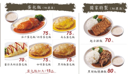 義大利麵 / 燴飯 / 蛋包飯 / 火鍋 / 鐵板麵 / 起士排飯 / 燻雞飯