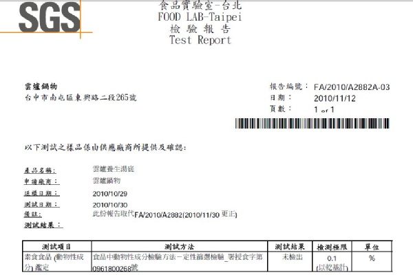 "雲爐養生湯底"採用海拔1500~2500公尺(白雲的高度)生長的山中野菜以及新鮮的牛蒡、當歸,20幾種蔬果、香料、中藥熬煮而成,零脂肪、低熱量(2大卡/100g)、可全素食,捨棄了便宜的大骨粉、雞骨粉等動物性調味料,是因為不想讓雲爐的湯底是不健康的湯底,雲爐養生湯底不加味精,喝了不會口乾舌燥喔!(檢驗報告如上圖)